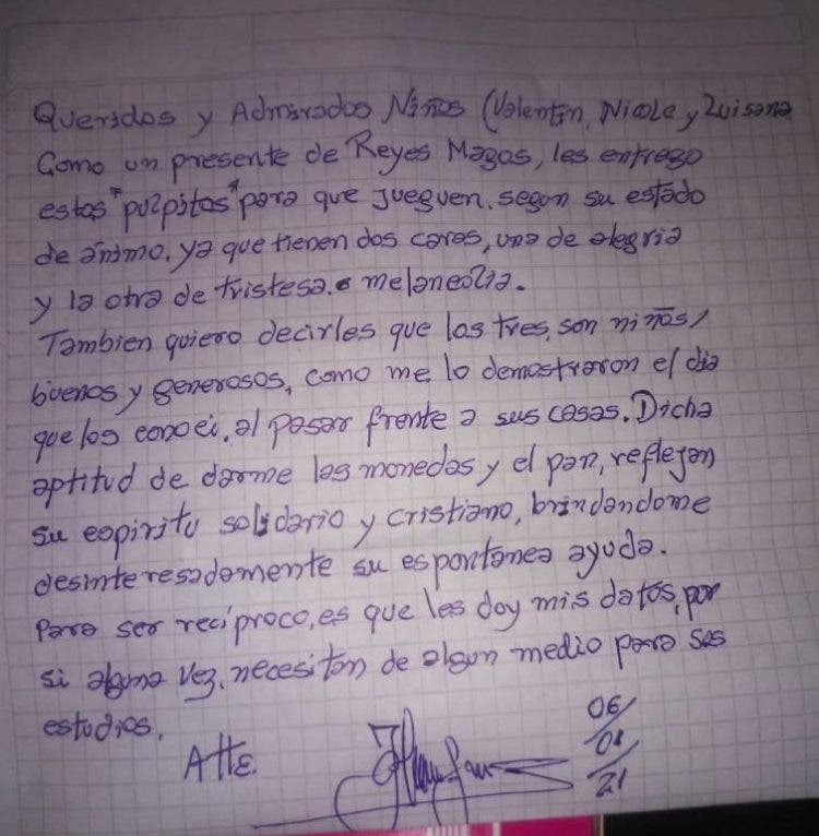 Además de los regalos, les dejó una carta que desde que se difundió en las redes conmovió a muchas personas: