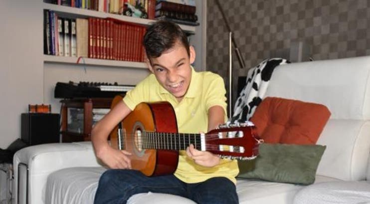 A pesar de sus dificultades, Adrián le pone todo a su canto y toca varios instrumentos.
