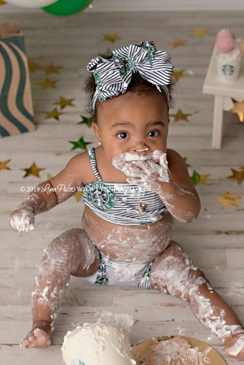 La mujer vio el atuendo por Internet y se le ocurrió hacer algunas fotografías de la bebé disfrutando de un pastel pero no quería hacer nada muy cliché y fue en ese momento en el que pensó en el café de Starbucks.