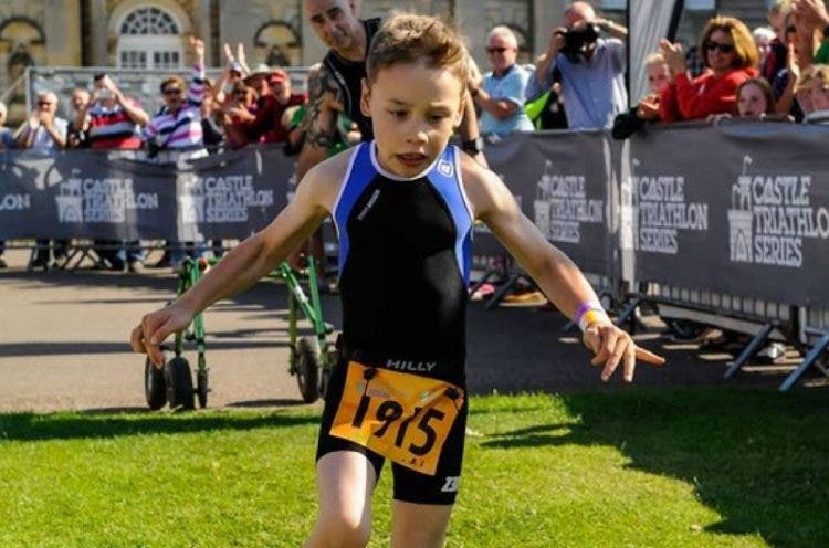 El pequeño se preparó mucho para desarrollar y terminar su primer triatlón, el del castillo Howard en Inglaterra. El mismo consta de 100 metros de natación en lago, 4 km en bicicleta y 1,300 km corriendo.