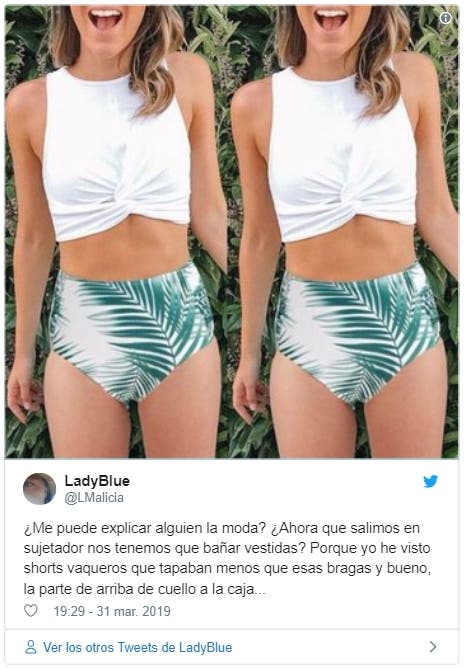 «¿Me puede explicar alguien la moda? ¿Ahora que salimos en sujetador nos tenemos que bañar vestidas? Porque yo he visto shorts vaqueros que tapaban menos que esas bragas y bueno, la parte de arriba de cuello a la caja…», se lee en otra publicación.