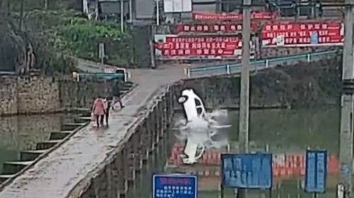 Las imágenes muestran a este nuevo conductor girando a la izquierda en el puente por donde estaban caminando tres personas. Después Zhang se desvía al costado de la carretera y finalmente cae al río.