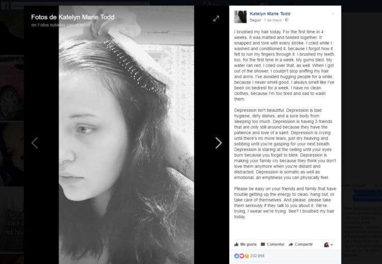 Con una selfie, sosteniendo un cepillo sobre su cabello, Katelyn confiesa un triste relato que describe sus sentimientos más íntimos y la dura situación que supone enfrentar la depresión:
