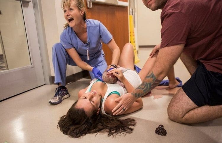 Desesperada y agotada le pide a su esposo que atrape a su bebé mientras da a luz en un pasillo