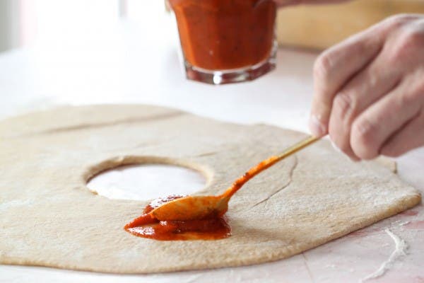 Una de las razones por las que esta receta es increíble es porque queda tal como una pizza casera, además puede hacerse con harina de trigo entero y por si fuera poco tiene esta receta lleva salsa en un conveniente agujero en el centro para sumergir cada trozo y lograr bocados perfectos y mucho más sabrosos.