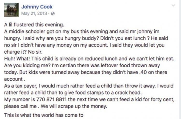 Cook pensó que esto era sumamente extraño ya que la escuela contaba con servicio de cafetería y allí se espera que los chicos reciban un buen almuerzo. Cuando le preguntó al pequeño por qué no había podido comer, se sintió profundamente indignado con su respuesta.