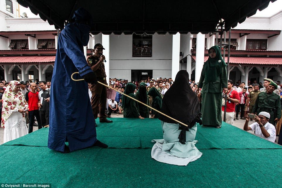 En las imágenes se puede ver cómo este mismo hombre que está cubierto con un velo de tela azul, azotó al hombre y a la mujer con una rama de bambú delante de los niños como parte del cumplimiento de las estrictas leyes de Indonesia.