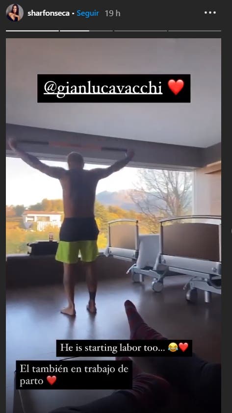 Con humor, Sharon mostró a Gianluca haciendo ejercicios diciendo que él también estaba en trabajo de parto.