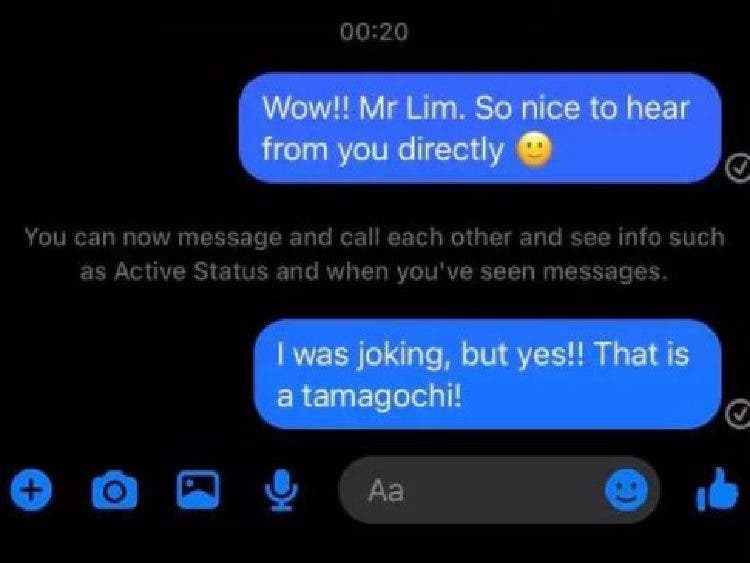 “¡Wow, señor Lim! Es muy agradable escucharlo directamente de usted. Estaba bromeando, pero sí, ese es un tamagotchi”, apuntó Lai.