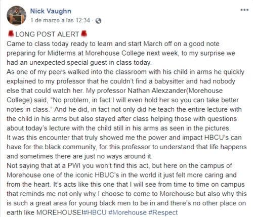 ‘Mi profesor NATHAN ALEXANDER dijo: «¡La sostendré para que pueda tomar buenas notas!» #HBCU #morehouse #Respeto», escribió Nick Vaghn