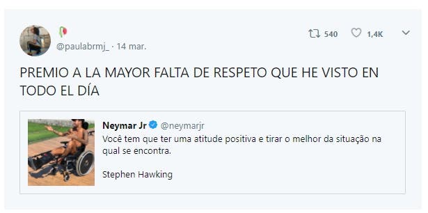 Efectivamente, el futbolista se encontraba en Brasil recuperándose de la intervención de su pie derecho, que le ha impedido presentarse a los encuentros con sus rivales, pero sus seguidores no han tardado en reaccionar con ira e indignación al tratar de compararse con el astrofísico fallecido, que tenía la enfermedad de Charcot.