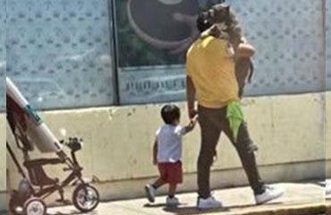 Un perro transitaba en la calle en los brazos de su padre como si fuera su bebé, el pitbull estaba complacido de ser cargado por su dueño en el camino. …