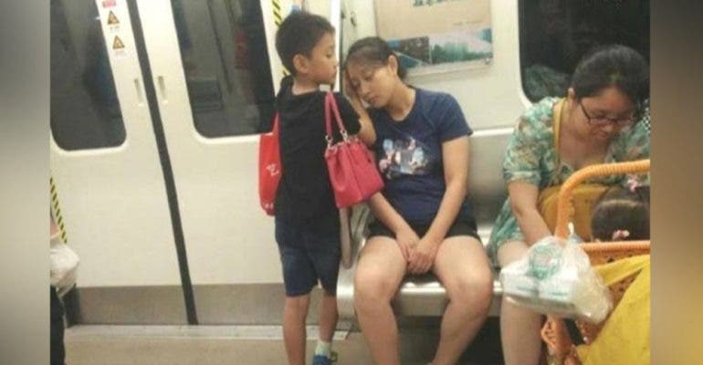 La imagen de un hermoso niño compasivo usando sus manitas para sostener la cabeza de su madre, que se quedó dormida en un tren por tanto agotamiento, está tocando millones …
