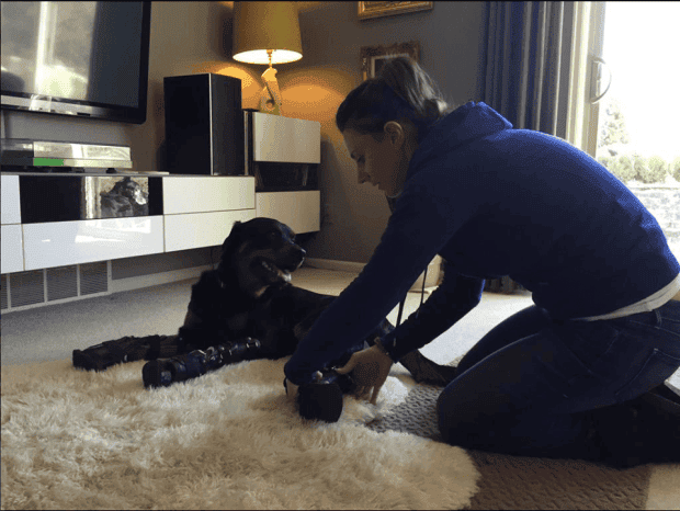 Cada día su dueña le coloca las prótesis con mucho amor. Al principio fue como ver a un bebé caminar por primera vez.