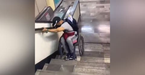 Para cualquier persona discapacitada, un viaje en el Metro, sobre todo en los sistemas de transporte público latinoamericanos, representa toda una peripecia, aunque para un hombre en silla de ruedas pareciera no ser mayor problema, pues demostró que su condición no le impide subir y bajar las escaleras con suma destreza.