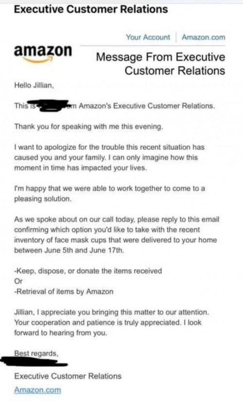 “Acabo de hablar con Amazon de nuevo. Pudieron detener una orden adicional en donde enviarían mil cajas más hacia mi casa. Todavía no podemos decir cuántas más se encuentran en camino”, dijo Jillian.