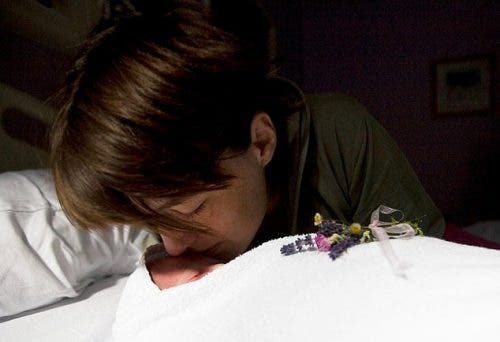 Mientras su esposo, Woody, permanecía a su lado sosteniendo un folleto llamado «¿Qué hacer cuando muere tu bebé?».