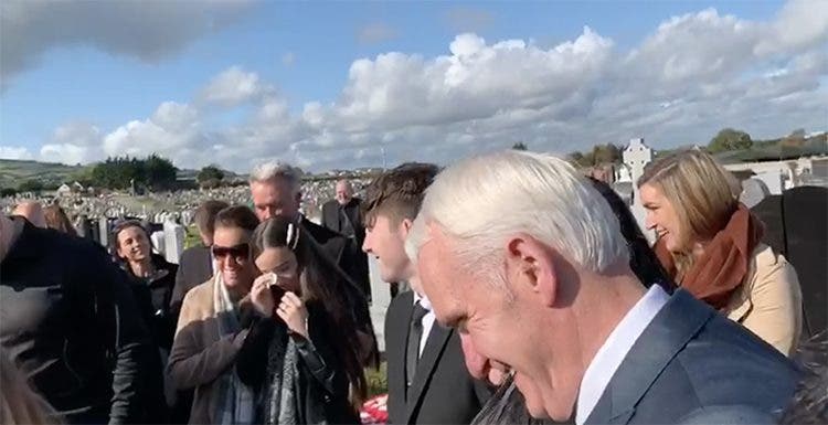 De repente, se empieza a escuchar desde adentro del féretro el sonido de una gaita irlandesa, y sonidos que simulan golpes en el ataúd. La voz del difunto inundó el apesadumbrado ambiente.