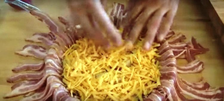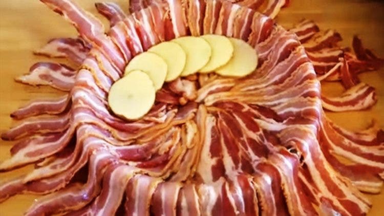 5.- Cubrir esta pequeña montaña de patatas y queso con las tiras de bacon que habían quedado por fuera del la fuente.
