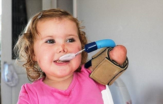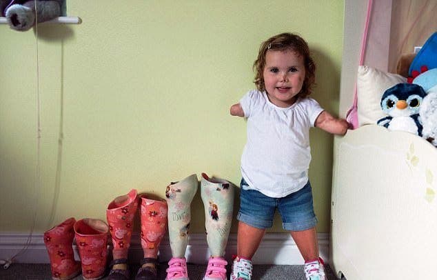 Niềm vui của cô bé Harmonie-Rose Ivy Allen khi nhận được một cô búp bê.Harmonie-Rose Ivy Allen bị một căn bệnh quái ác hành hạ khiến em phải cắt bỏ tay và chân từ nhỏ.Nguồn: boredpanda