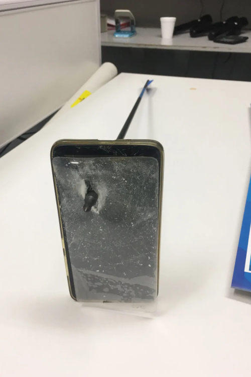 Previendo que algo terrible podía ocurrir, mientras descendía, el hombre sacó su teléfono móvil para capturar en vídeo la escena. Y gracias a ello, la flecha terminó en el teléfono, atravesándolo como si fuera una simple barra de mantequilla y evitando que fuera herido.