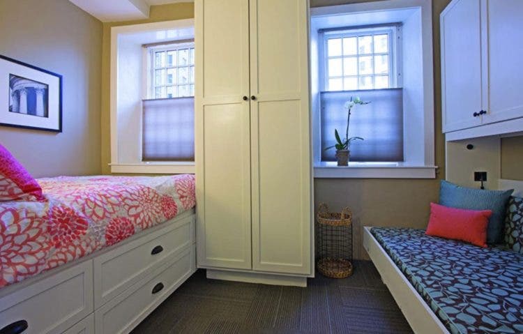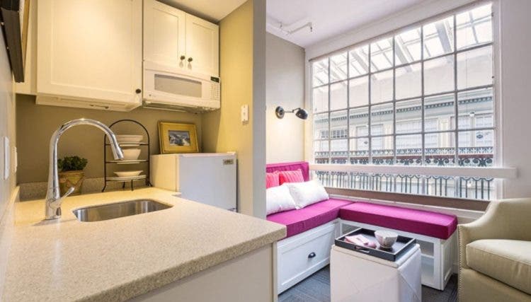 Cada apartamento tiene muebles incorporados, entre esos, una cama con cajones y asientos acolchados.