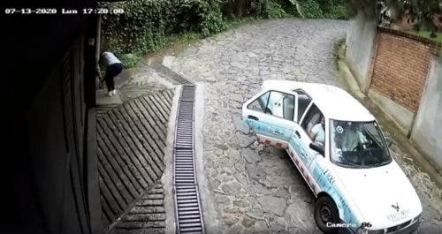 En las imágenes podemos ver a un automóvil que transita por una de las vías de Valle de Bravo, Estado de México, que pasa frente a la casa donde se detiene para que se baje una mujer apresuradamente dejando la puerta abierta y con una sonrisa de oreja a oreja.
